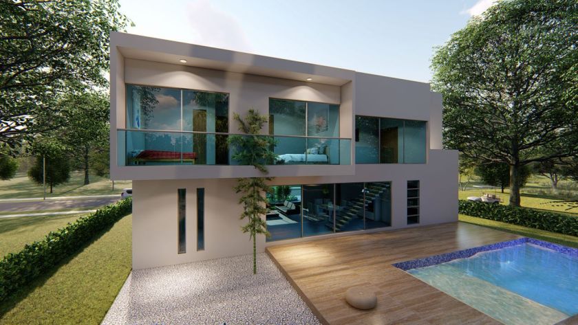 Casas de dos niveles con sus anexidades como piscina, área de BBQ, terrazas y zona de fogata.